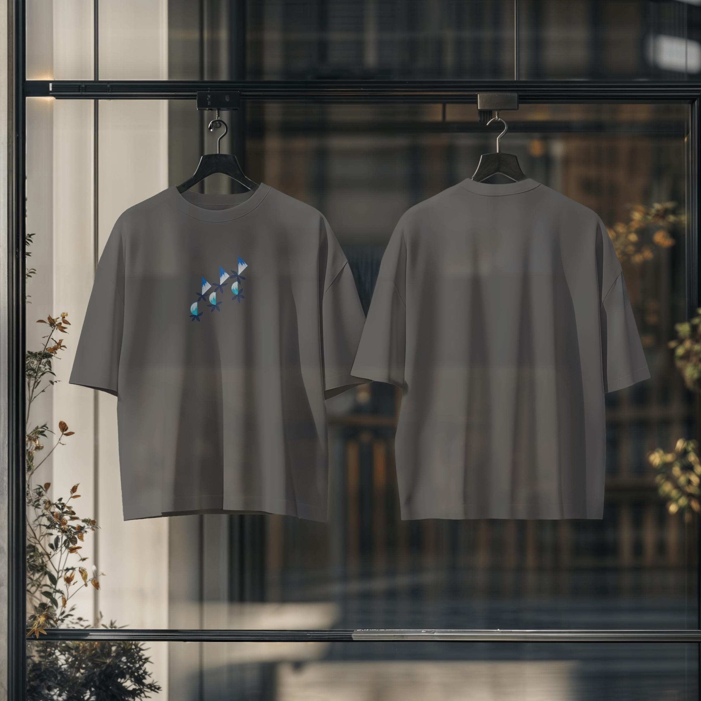 The front features a refined geometric floral composition, blending soft blue tones with clean, structured shapes and delicate botanical elements. This design creates a balanced contrast between nature and geometry, offering a subtle yet distinctive visual statement.