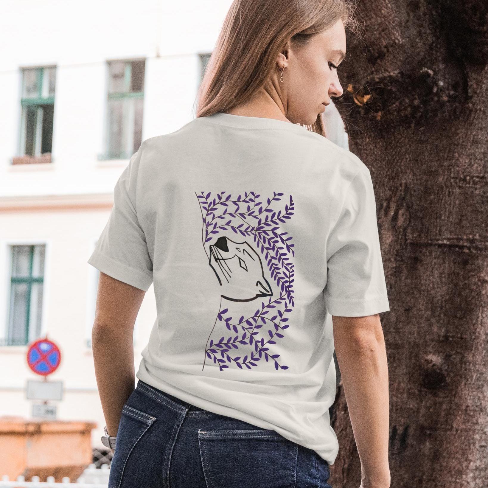 The back design features a minimalist line-art cat framed by delicate botanical elements in soft purple tones, creating a calm and balanced composition. The flowing leaves add movement and elegance, while the clean cat outline brings a subtle focal point that feels both personal and expressive.